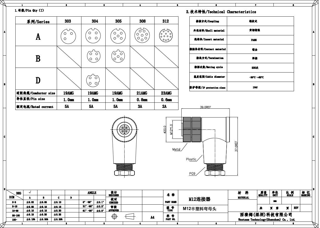 M12 4pin plastic right angle female plug